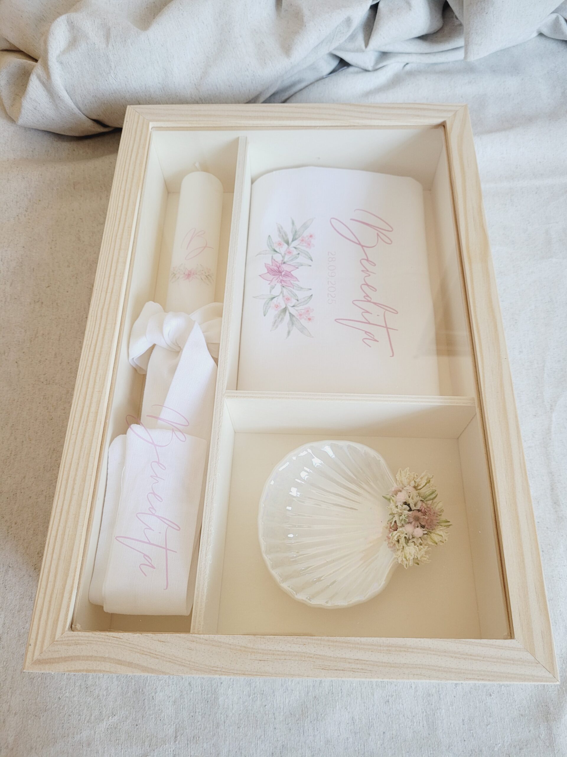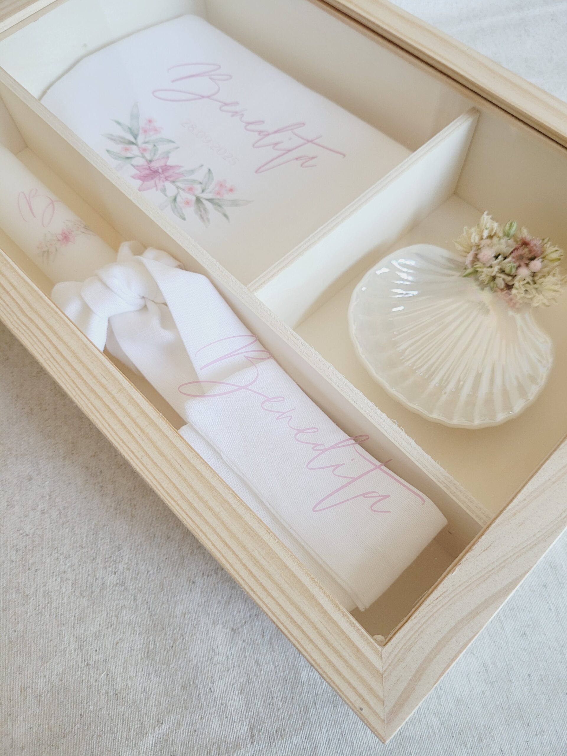 A Caixa de Batismo XL foi cuidadosamente desenhada para acondicionar, de forma delicada, a vela, a concha e a toalha, reunindo assim o conjunto essencial para este momento especial.