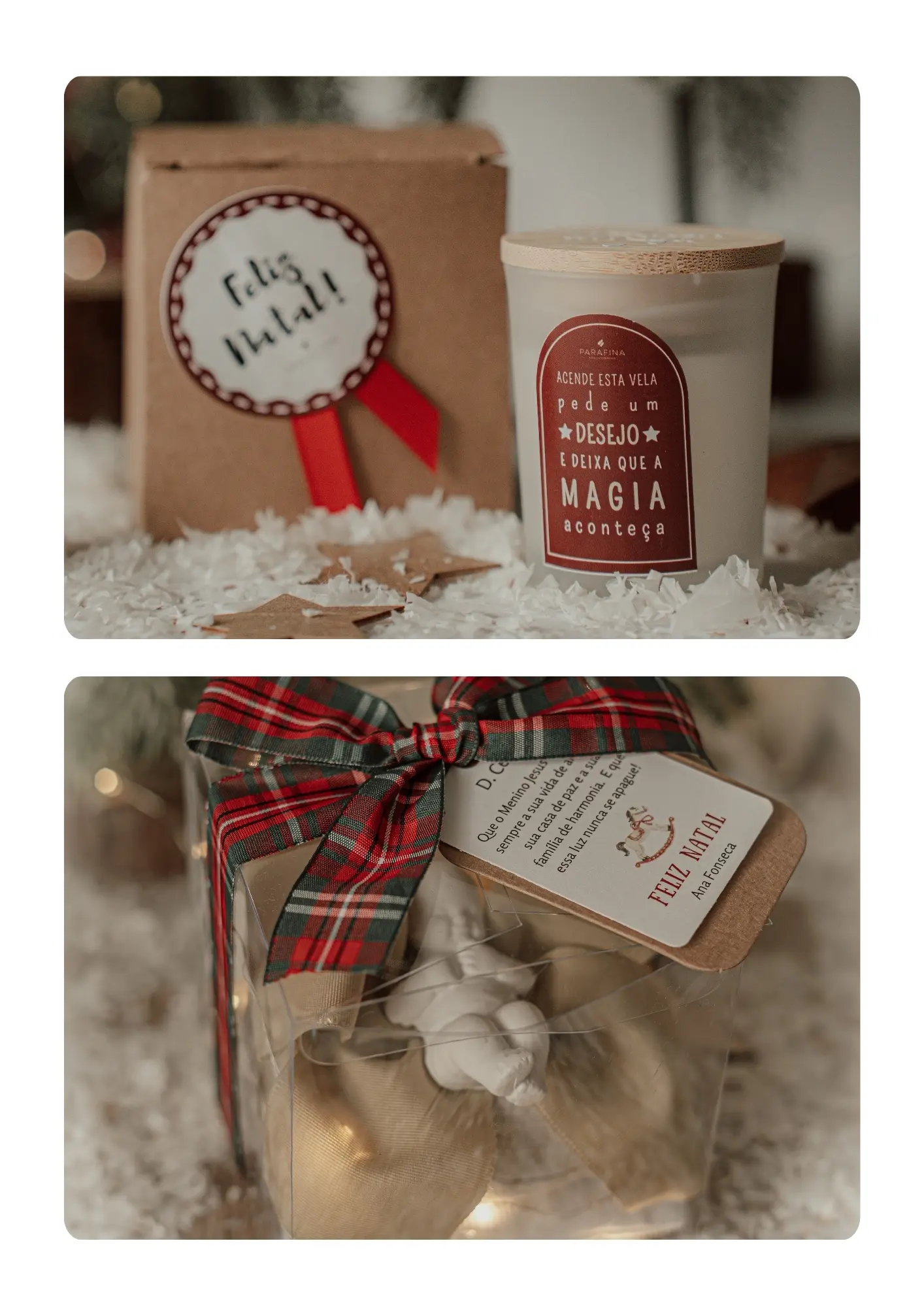 • Box perfumada com essência de talco e etiqueta com mensagem personalizada, contendo a vela e o Menino Jesus