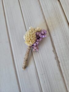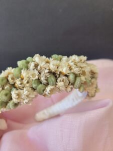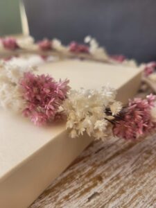 • Vela redonda gravada, com fio decorativo e flores preservadas em tons de creme, rosa velho e verde água