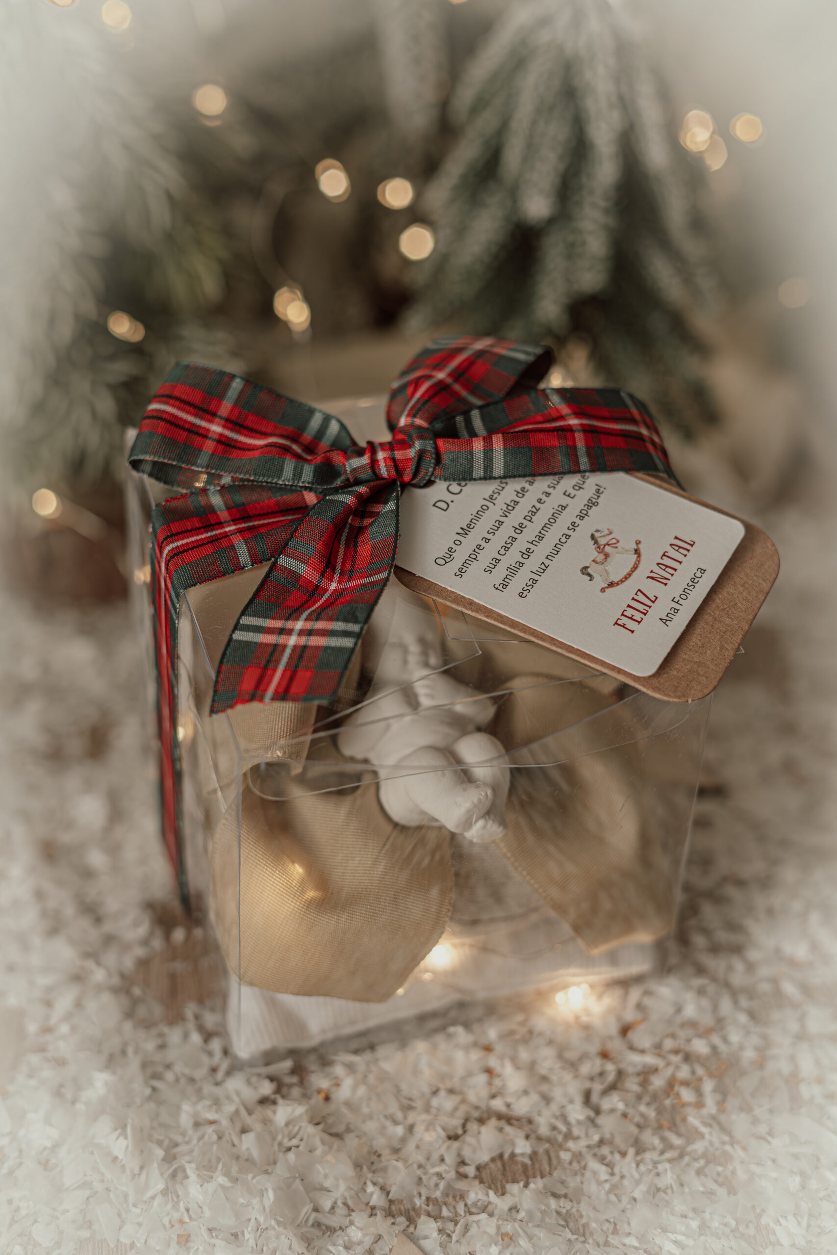 - Menino Jesus perfumado com essência de talco (dimensões 6 x 3,5cm) aplicado em conjunto de almofadas com 9 x 9cm (Atenção: as almofadas podem ser em tecido branco, bege ou xadrez em tons de vermelho, em combinações aleatórias mediante stock disponível).