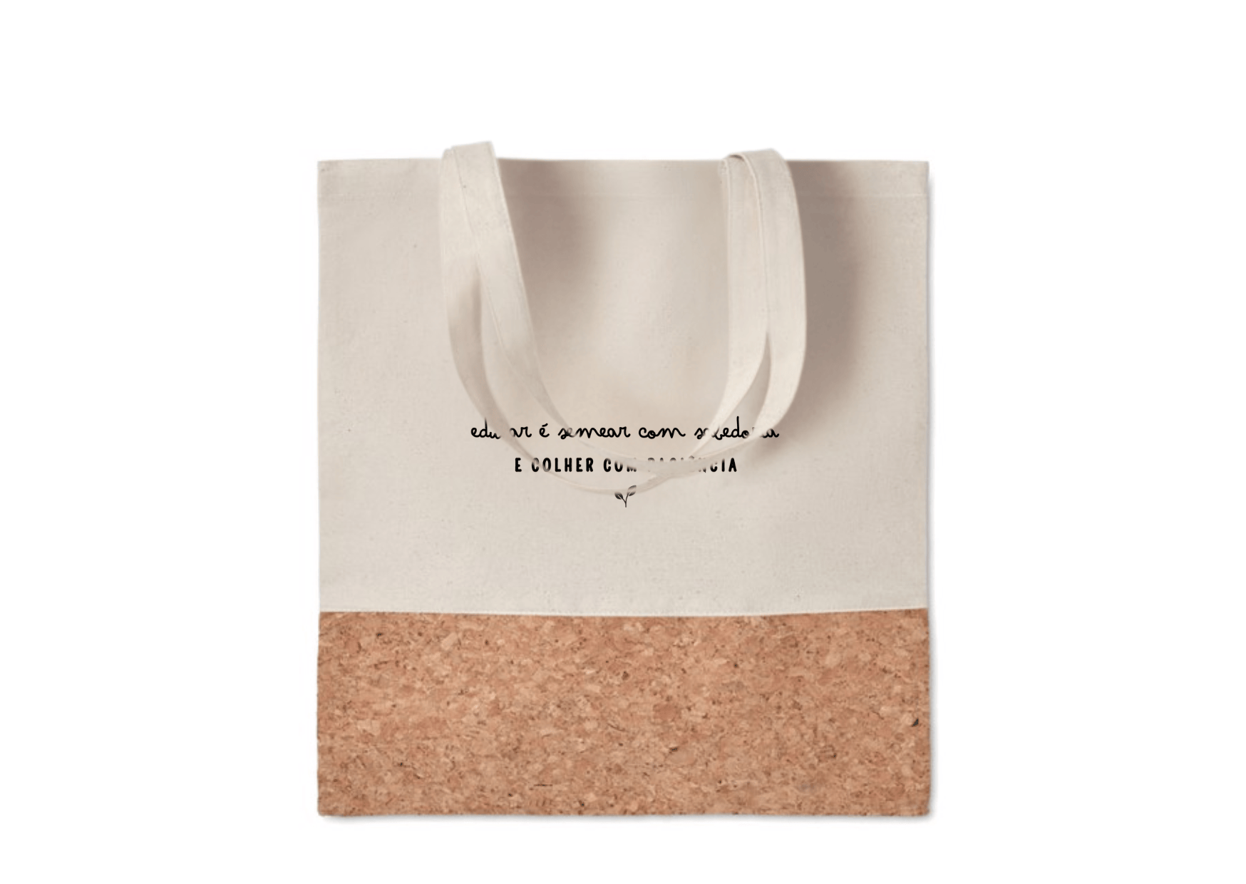 Feita em algodão de 160 gr/m² com detalhe em cortiça e alças longas, esta tote bag é diferente, versátil e muito bonita. Acondicionada numa box personalizada com etiqueta personalizável (remetente e destinatário).